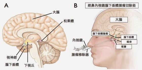 腦下垂體(pituitary gland)位於腦底部的中央位置,是身體中激素的主要控制中心。正常腦下垂體會產生幾種重要激素:促腎上腺皮質激素會刺激腎上腺; 甲狀腺激素會刺激甲狀腺; 黃體化激素和濾泡刺激素與性器官產生作用; 生長激素會幫助糖之新陳代 催乳激素會影響乳汁分泌。