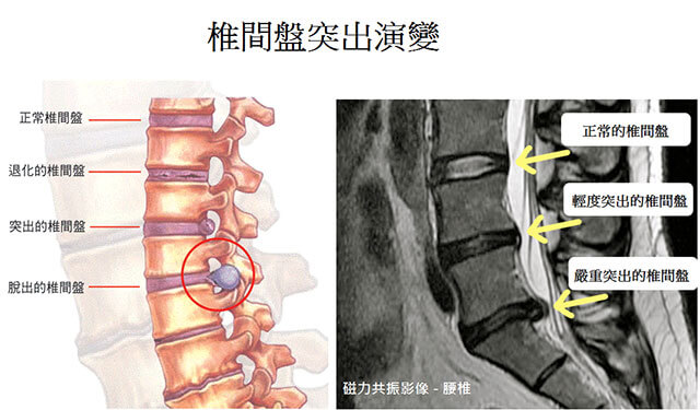 腰椎的病變,除了腰酸背痛之外,病人亦會可能有坐骨神經痛的症狀。人體脊柱椎間盤內的壓力,會在咳嗽、打噴嚏和大便時提升,所以這些日常習慣和行為亦會誘發或加劇椎間盤突出的症狀。因為當我們體內壓力上升時,已經病變的椎間盤的周邊纖維環亦會加劇膨脹,甚至破裂,椎間盤中間的髓核就有機會通過裂口溢出,釋放出一種自由氧化基的化學物質,令附近組織和神經線嚴重發炎。此時病人的腰部和腳部就會有神經劇痛、麻痹、冇力的感覺,症狀令病人不能翻身、伸腰或坐著。