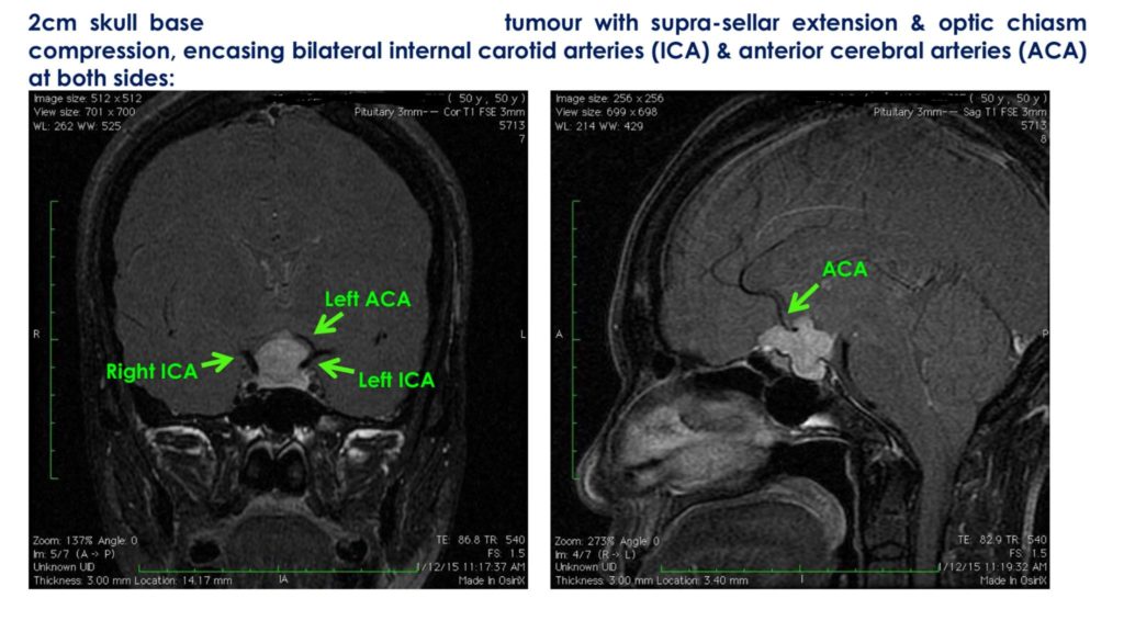 在中國的MRI顯示在腦下垂顱底骨基部有2厘米的腫瘤,向腦上延伸和壓迫著視覺神經,在兩側亦包住雙側腦內主大動脈(ICA)和前大腦動(ACA)。