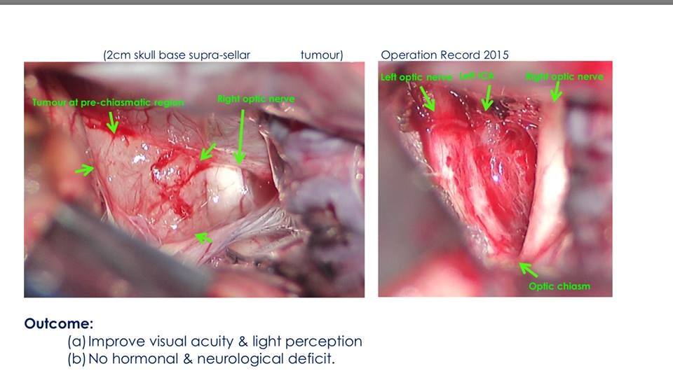 在顯微鏡下,將腫瘤全面切除,視覺神經得到減壓,雙側腦內主大動脈(ICA)和前大腦動脈(ACA)得以保存完好。